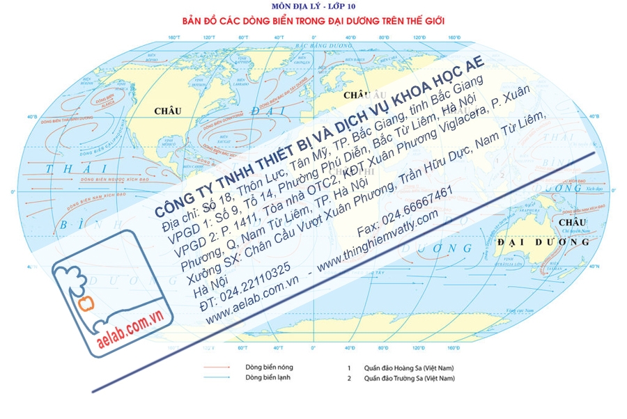 - Bản đồ treo tường thể hiện nội dung: các dòng biển nóng và các dòng biển lạnh trong 5 đại dương trên thế giới (nơi phát sinh, hướng chuyển động);