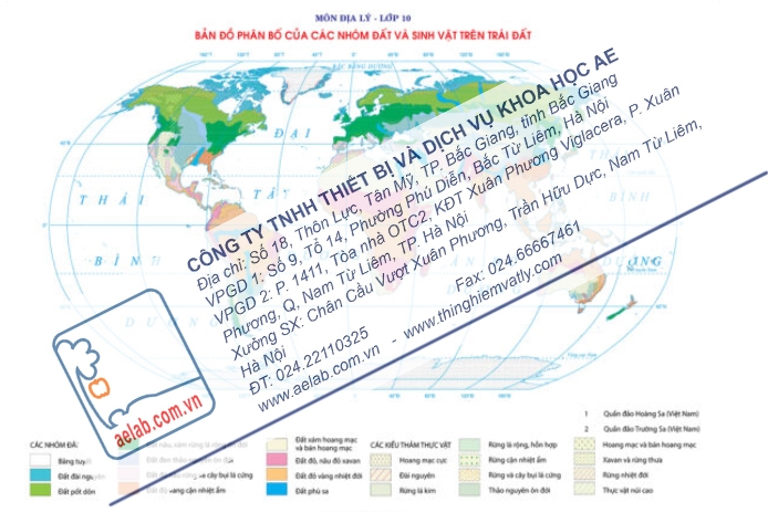 Bản đồ phân bố của các nhóm đất và sinh vật trên Trái Đất được sản xuất theo Thông tư số 39/2021/TT-BGDĐT ngày 30/12/2021 của Bộ trưởng Bộ Giáo dục và Đào tạo.