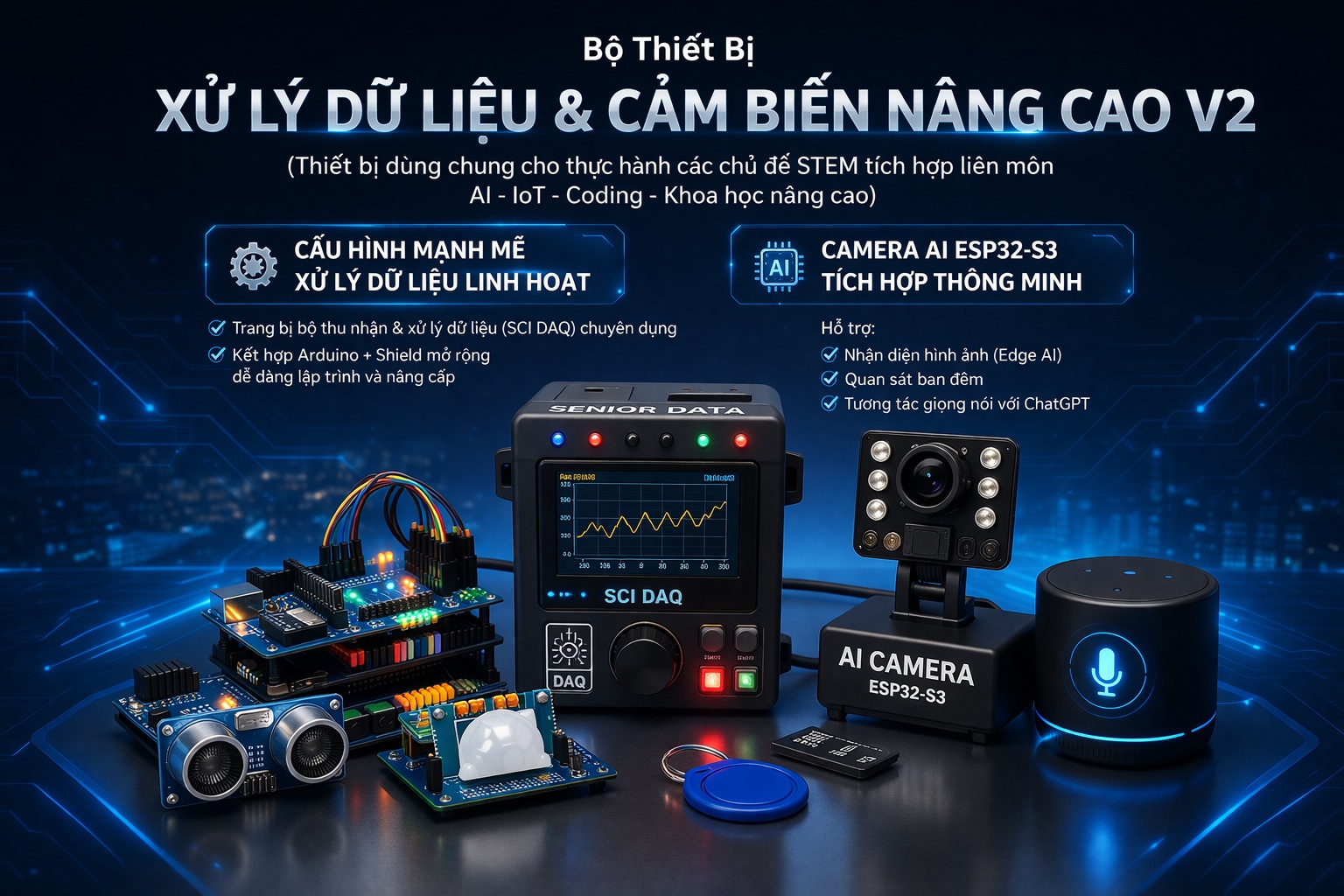 Bộ thiết bị xử lý dữ liệu và cảm biến nâng cao là giải pháp học tập STEM toàn diện, được thiết kế dành cho các hoạt động thực hành, thí nghiệm và nghiên cứu liên môn. Sản phẩm giúp học sinh tiếp cận các công nghệ hiện đại như AI, IoT, lập trình và khoa học dữ liệu một cách trực quan và thực tế.