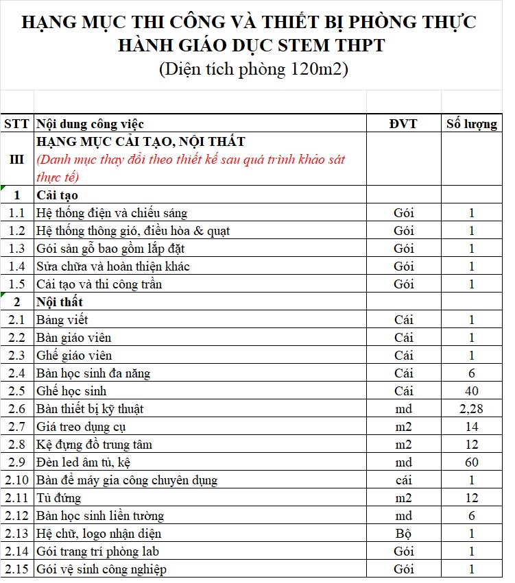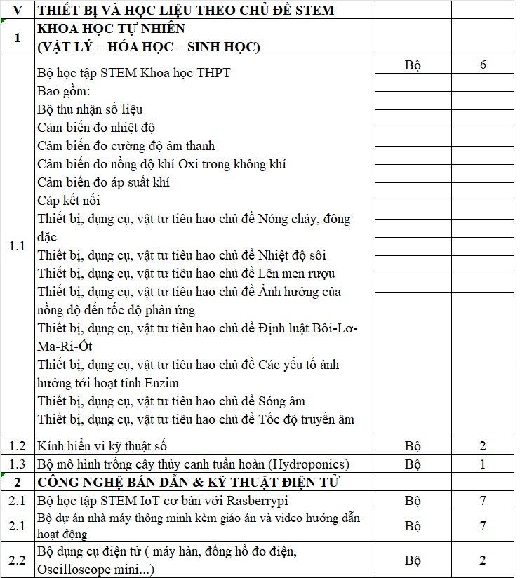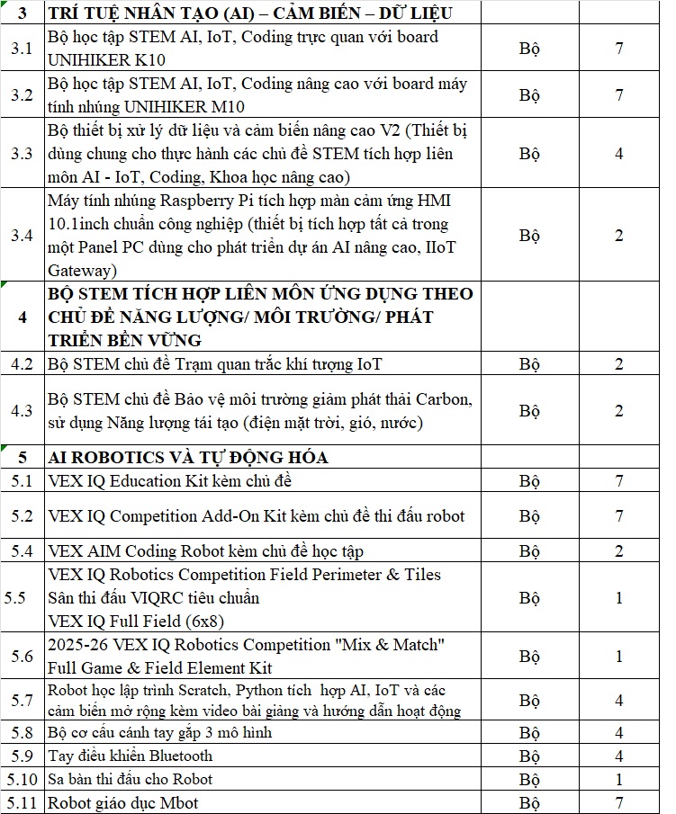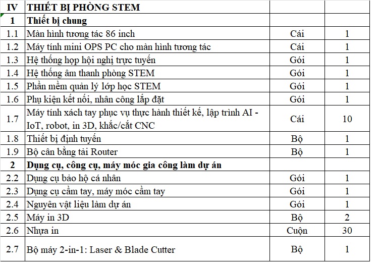 Dưới đây là danh mục tiêu biểu cho 1 phòng dạy học STEM