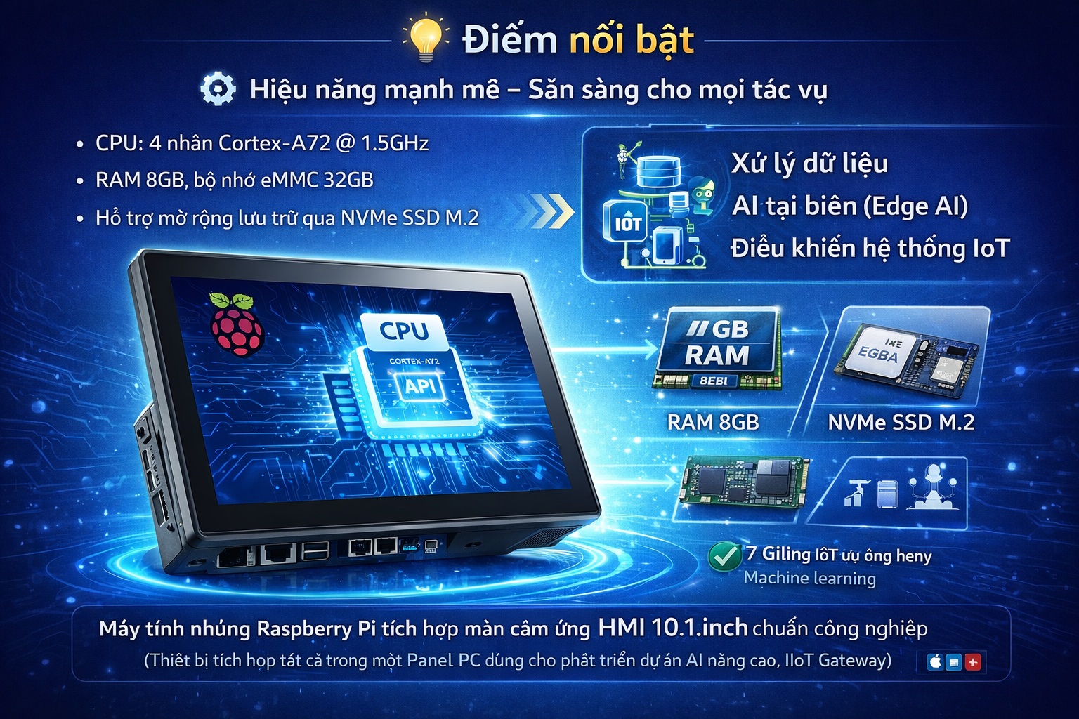 Thiết bị không chỉ là một màn hình HMI, mà còn là máy tính biên (Edge Computing) hoàn chỉnh, giúp người học và kỹ sư triển khai các ứng dụng thực tế ngay trên phần cứng.
