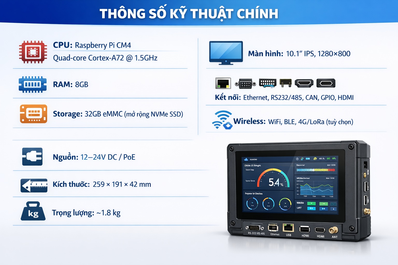 - Kết nối: Ethernet, RS232/485, CAN, GPIO, HDMI