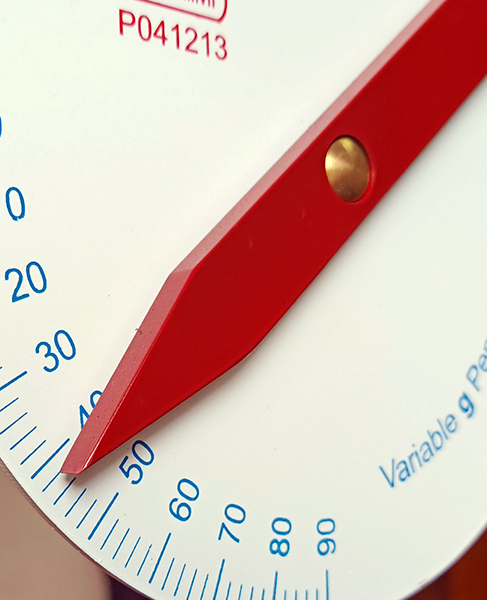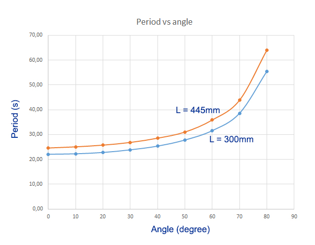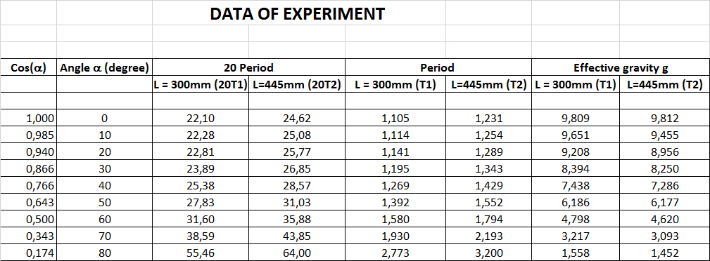 4. On the moon’s surface the “lunar acceleration of gravity” gm is only 16.6% of the earth’s acceleration of gravity g. Calculate the angle α and set it on the device such that the pendulum in the laboratory oscillates with the same oscillation period with which it would oscillate on the moon in a perpendicular position. Compare the measured oscillation period with the calculated one.