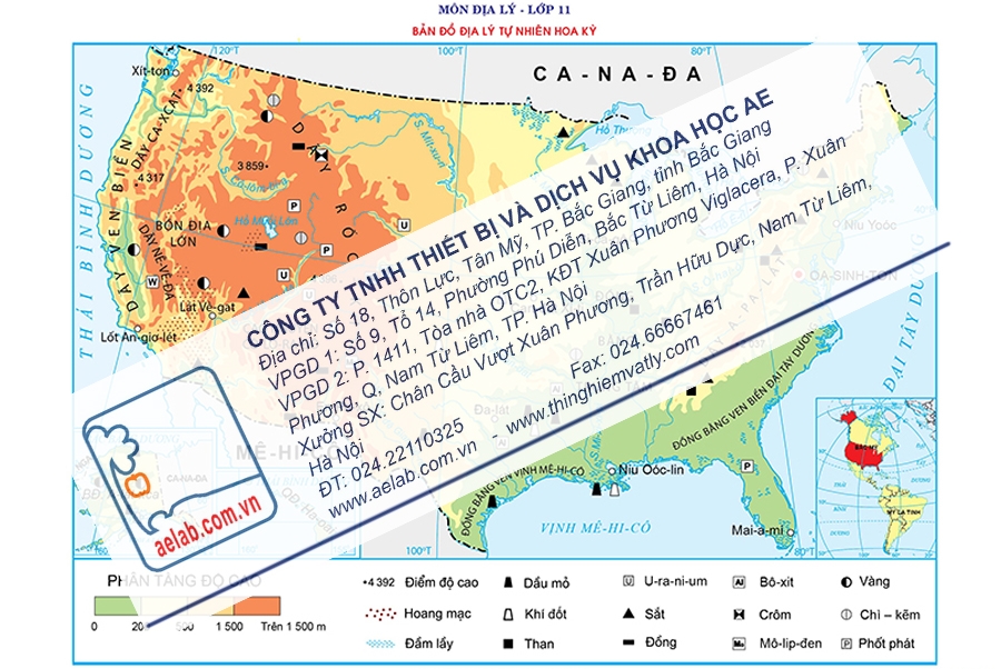 - Bản đồ treo tường thể hiện các điều kiện tự nhiên của Hoa Kì; ranh giới tiếp giáp với các quốc gia, các vùng biển;