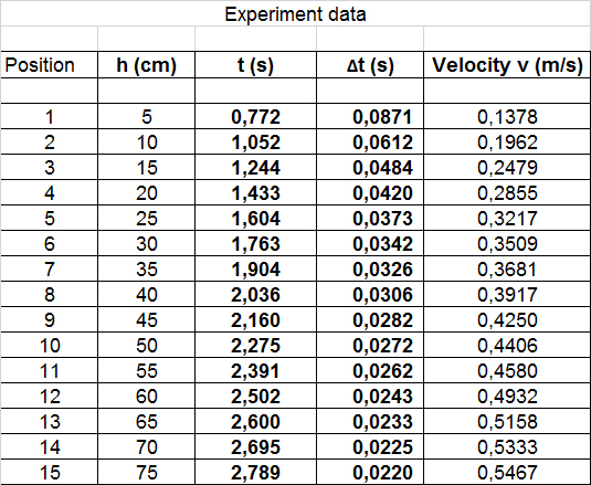 - Lập bảng số liệu như hình dưới: Vận tốc rơi tức thời của bán xe Maxwell được tính bởi công thức: