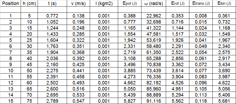 Động năng của bánh xe Ekin là tổng động năng quay và động năng tinh tiến, do đó ta có bảng số liệu bên trên:
