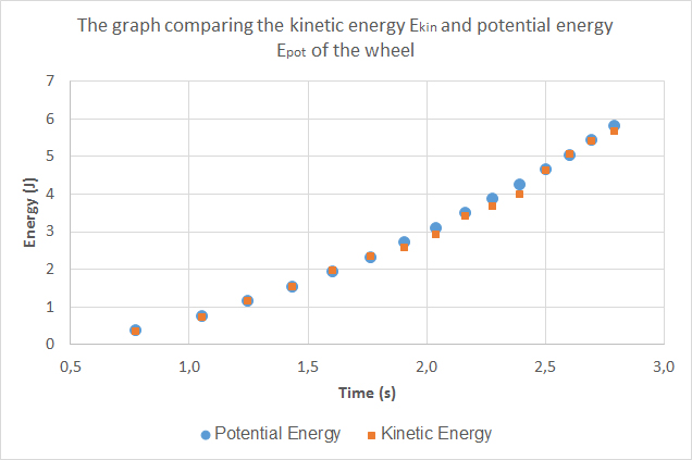 Vẽ đồ thị Thế năng và động năng của bánh xe, ta có nhận xét: Thế năng gần như chuyển hoàn toàn sang động năng, điều đó khẳng định sự bảo toàn cơ năng của thí nghiệm bánh xư Maxwell.