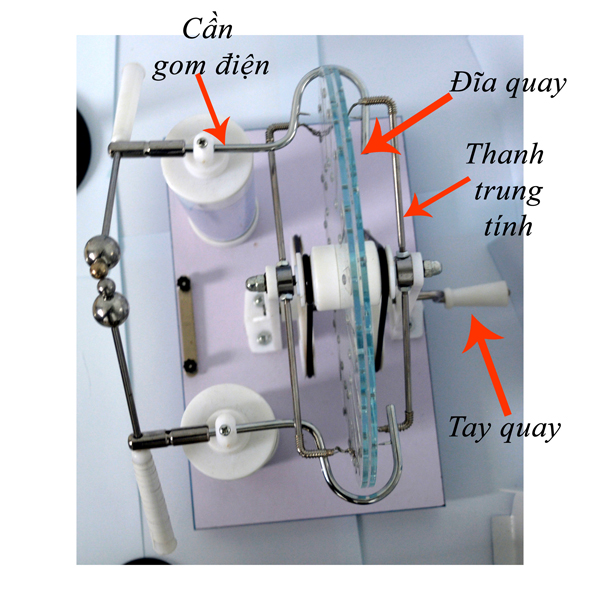 1. Hai đĩa làm bằng chất cách điện tốt: trên mặt ngoài của đĩa có dán 20 lá nhôm mỏng cách đều nhau; Hai đĩa được đặt song song, đồng trục và quay ngược chiều nhau nhờ một cơ cấu truyền động gồm tay quay, các dây đai cao su,.
