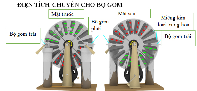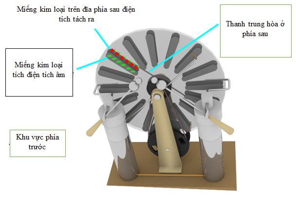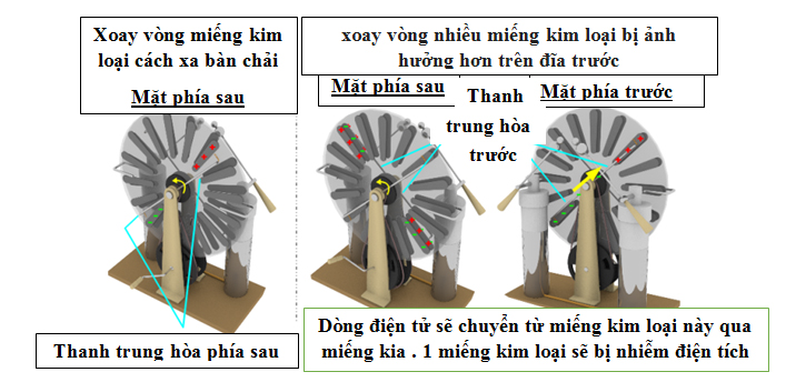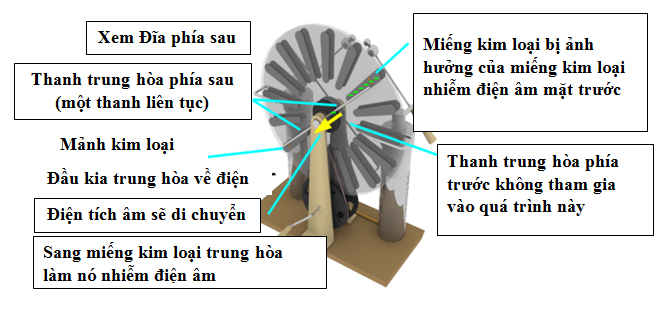 Khi đĩa quay các miếng kim loại ra khỏi thanh trung hòa, khu vực đầu tiên được để lại tích điện dương do có một số điện tích âm được lấy từ nó. Và khi nhận được điện tích âm đó, mảnh kim loại còn lại mang điện tích âm.