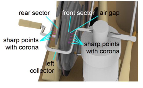 Bộ gom điên tích không chạm vào các mảnh kim loại. Thay vào đó, nó có những điểm sắc nhọn đối diện với các mảnh kim loại và có khoảng cách không gian giữa chúng. Đây là một kỹ thuật quen thuộc mà chúng ta đã thấy trước đây trong các chức năng của máy phát điện Van de Graaff . Mỗi bộ gom có các điểm sắc nhọn đối diện với các mảnh kim loại trên cả hai đĩa tạo thuận lợi cho việc gom điện tích.