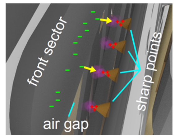 Sử dụng bộ gom bên trái làm ví dụ, điện tích âm trên các miếng kim loại sẽ đẩy các electron khỏi các đầu nhọn, để lại một điện tích dương. Vì chúng là những điểm sắc nhọn, nên điện tích dương được nhồi nhét lại với nhau tạo ra một điện trường mạnh trong khoảng cách gần các điểm. Trường điện mạnh mẽ này tách các phân tử không khí ra ngoài và bắt đầu quá trình làm cho không khí dẫn điện, tạo thành một hiệu ứng điện hoa gần các điểm. Đó là không khí dẫn điện gây ra điện tích âm của các miếng kim loại vượt qua khoảng cách tới bộ gom. Điều đó khiến các mảnh kim loại trung hòa điện tích trở lại.