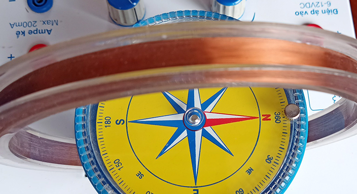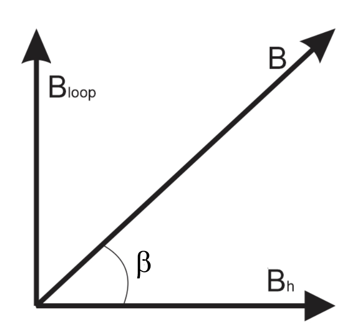 Kim nam nam châm sẽ chịu tác động bởi từ trường trái đất theo phương ngang Bh và từ trường do vòng dây Bloop. Kim sẽ quay 1 góc β.