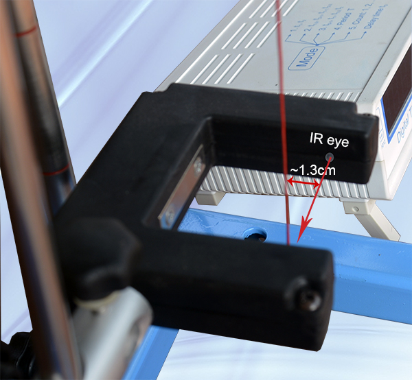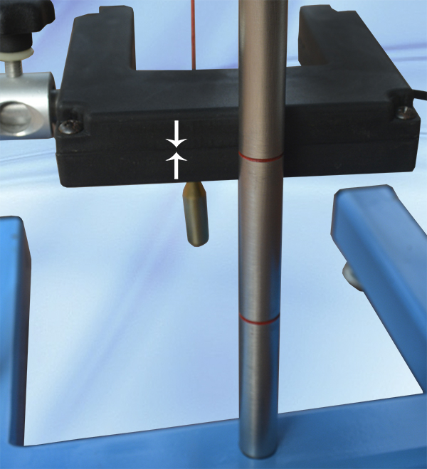 Thả quả dọi xuống (bằng núm xoay), điều chỉnh chân đế, cổng quang sao cho dây dọi cách mắt hồng ngoại khoảng 1.3cm (hình dưới). Lúc này viên bi rơi sẽ quét qua mắt quang học của cổng quang.