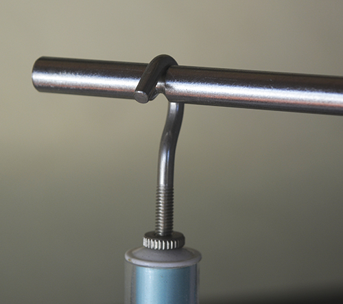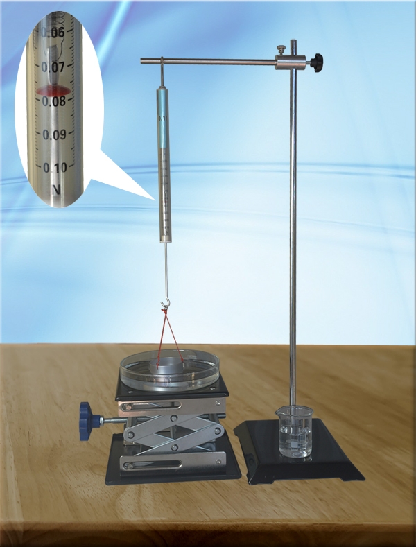 Bước 2: Treo lực kế. Đo giá trị lực kế khi treo vòng nhôm. Ghi lại P. Nâng chân đế đỡ đĩa thủy tinh lên sao cho mặt dưới của vòng kim loại ngập xuống mặt nước khoảng 2mm