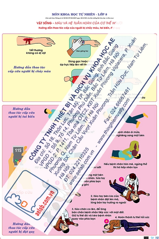Hướng dẫn thao tác cấp cứu người bị chảy máu, tai biến, đột quỵ (Tranh giấy) được sản xuất theo Thông tư số 38/2021/TT-BGDĐT ngày 30/12/2021 của Bộ trưởng Bộ Giáo dục và Đào tạo.