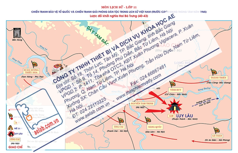 - Lược đồ treo tường. Nội dung lược đồ thể hiện diễn biến cuộc khởi nghĩa Hai Bà Trưng (40-43). Lược đồ có kèm hình ảnh các vị trí diễn ra khởi nghĩa.