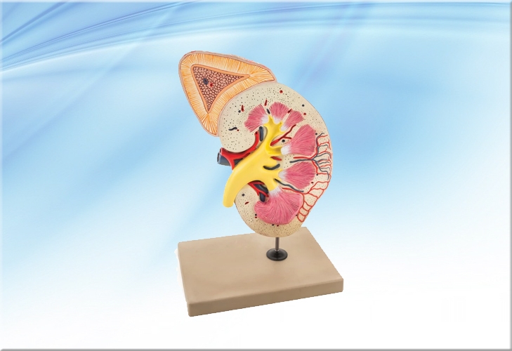 Mặt cắt dọc của mô hình thận phải cho thấy cầu thận, ống, một ống thu thập, kim tự tháp, hệ thống lỗ thận, xương chậu, phần trên của niệu quản và mạch máu thận