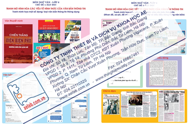 Tranh một số dạng/loại văn bản thông tin thông dụng. Tranh mô hình hóa các yếu tố hình thức của văn bản thông tin. Bộ tranh gồm 02 tờ: